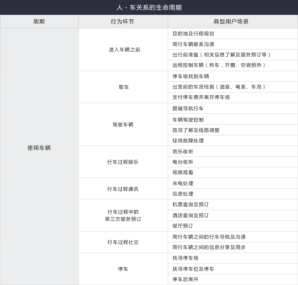 從整個“人-車互動生命周期”考慮,同時考慮不同用戶人群劃分,梳理出典型的車聯網用戶使用場景框架。用戶場景行為是一個動態的數 據庫,將基于用戶生活方式的變化,不斷迭代調整和補充完善。